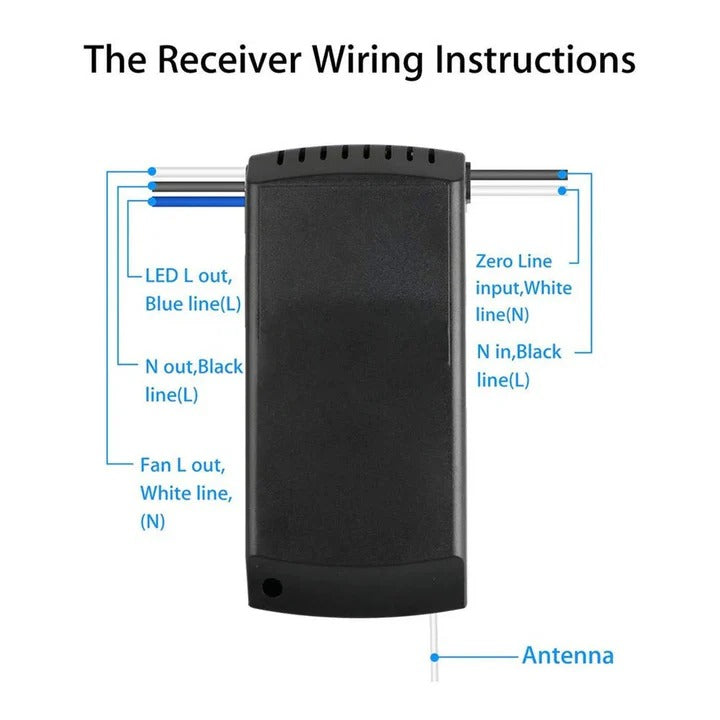 The receiver is meant to replace the existing fan control box, utilizing a 3-wire connection, and the included guide simplifies setup.