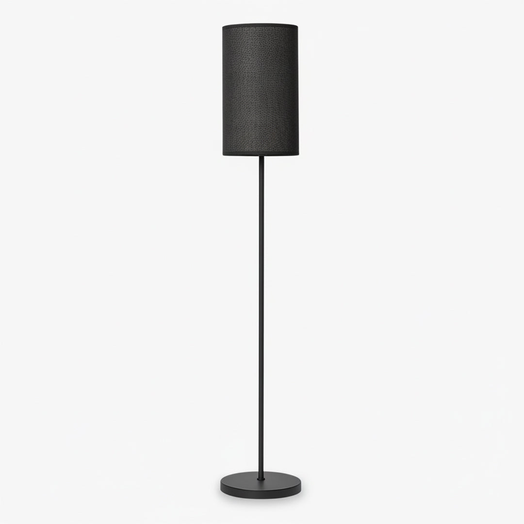 This floor lamp features a slim frame and a cylindrical fabric shade. It is suitable for a variety of indoor spaces and provides standard lighting for home use.