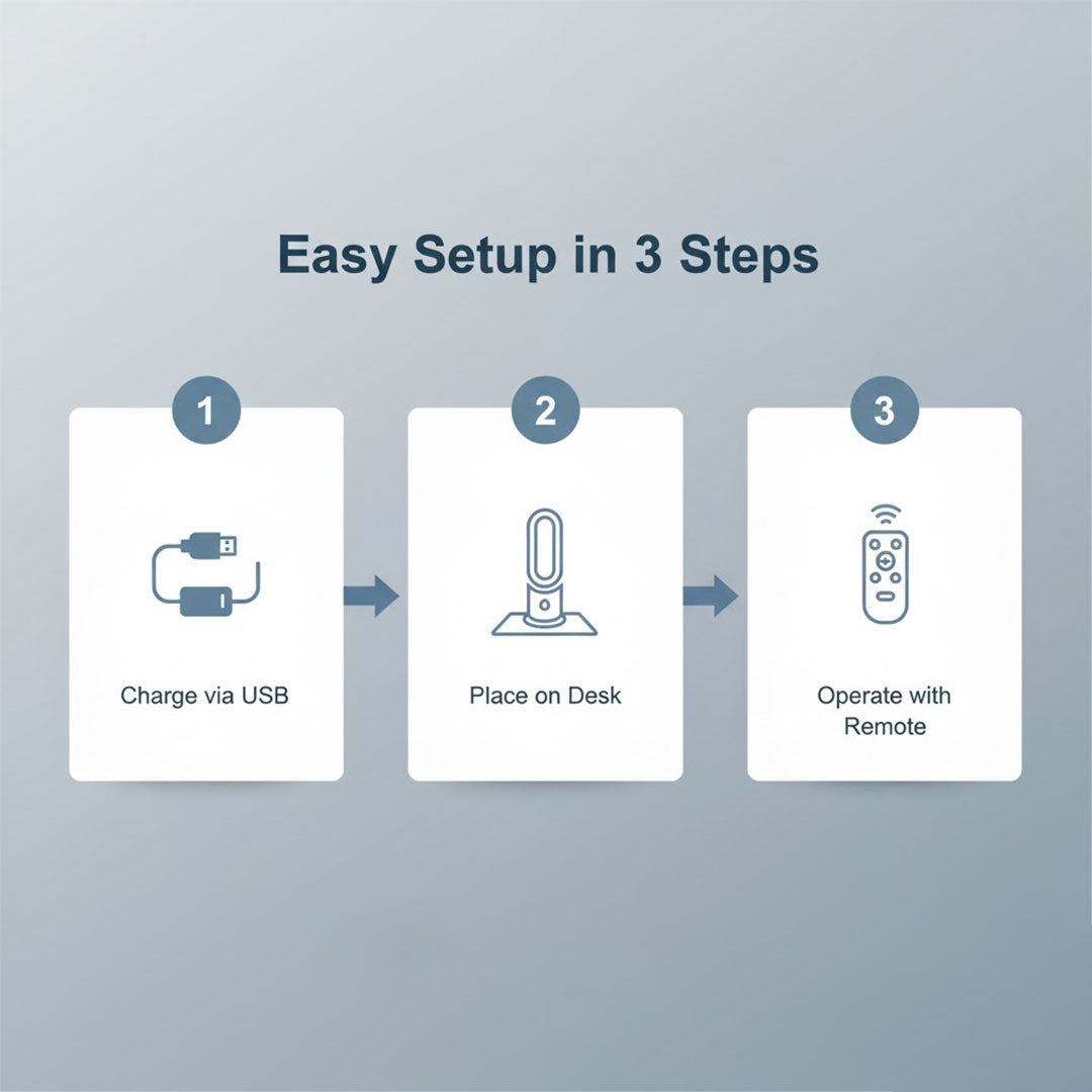 - Package contains: Bladeless desk fan, remote control, USB charging cable, and user manual.