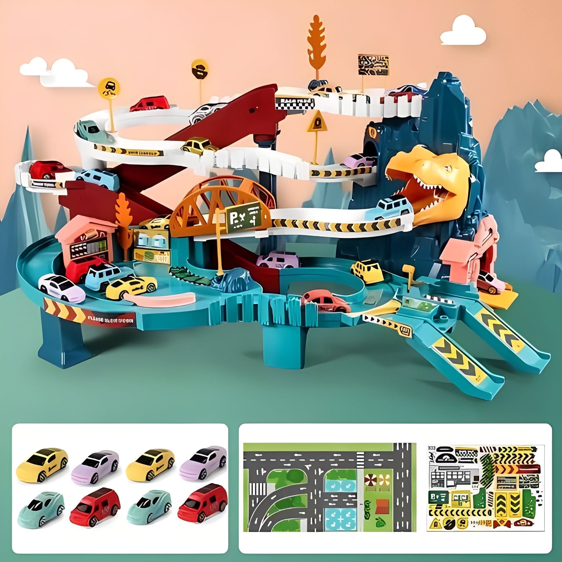 This dinosaur-themed racing playset is designed to provide an engaging environment for imaginative play. With a multi-level track structure, it may help children explore various twists and turns as they navigate their toy vehicles through the course.
