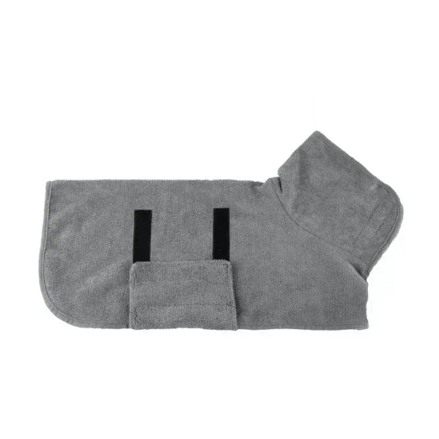 This bathrobe is crafted from a soft fabric that is designed to be gentle against your dog's skin. Its microfiber composition may help provide comfort while effectively absorbing moisture after various activities.