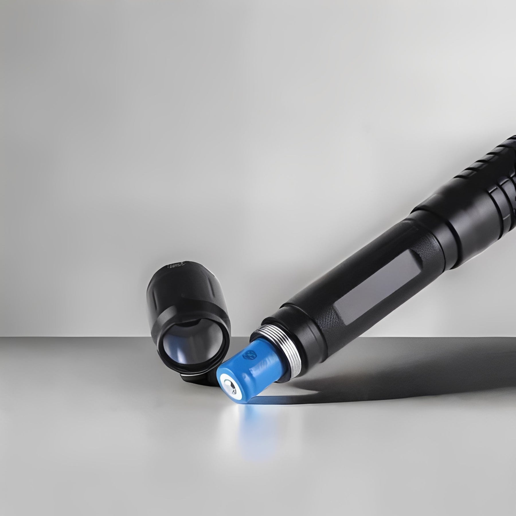 This flashlight features a rotating focus mechanism, allowing users to customize the beam width. In focused mode, it generates a concentrated blue beam that can assist with ignition under suitable outdoor conditions, depending on the materials used.