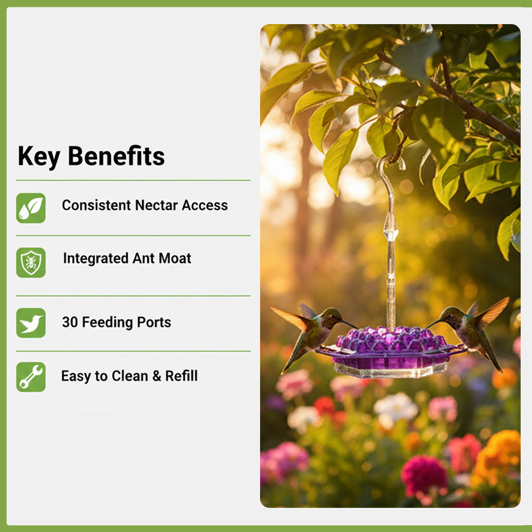 - Multiple Feeding Ports: Features thirty feeding ports strategically placed for easy access, allowing several hummingbirds to enjoy the nectar simultaneously.