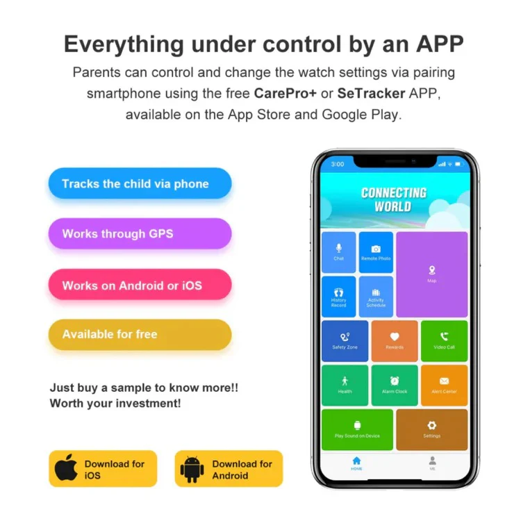 Parents can establish geo-fenced safe zones and receive notifications when their child enters or exits these areas. The watch also includes various practical tools, such as alarms, reminders, and a step counter, enhancing daily routines.
