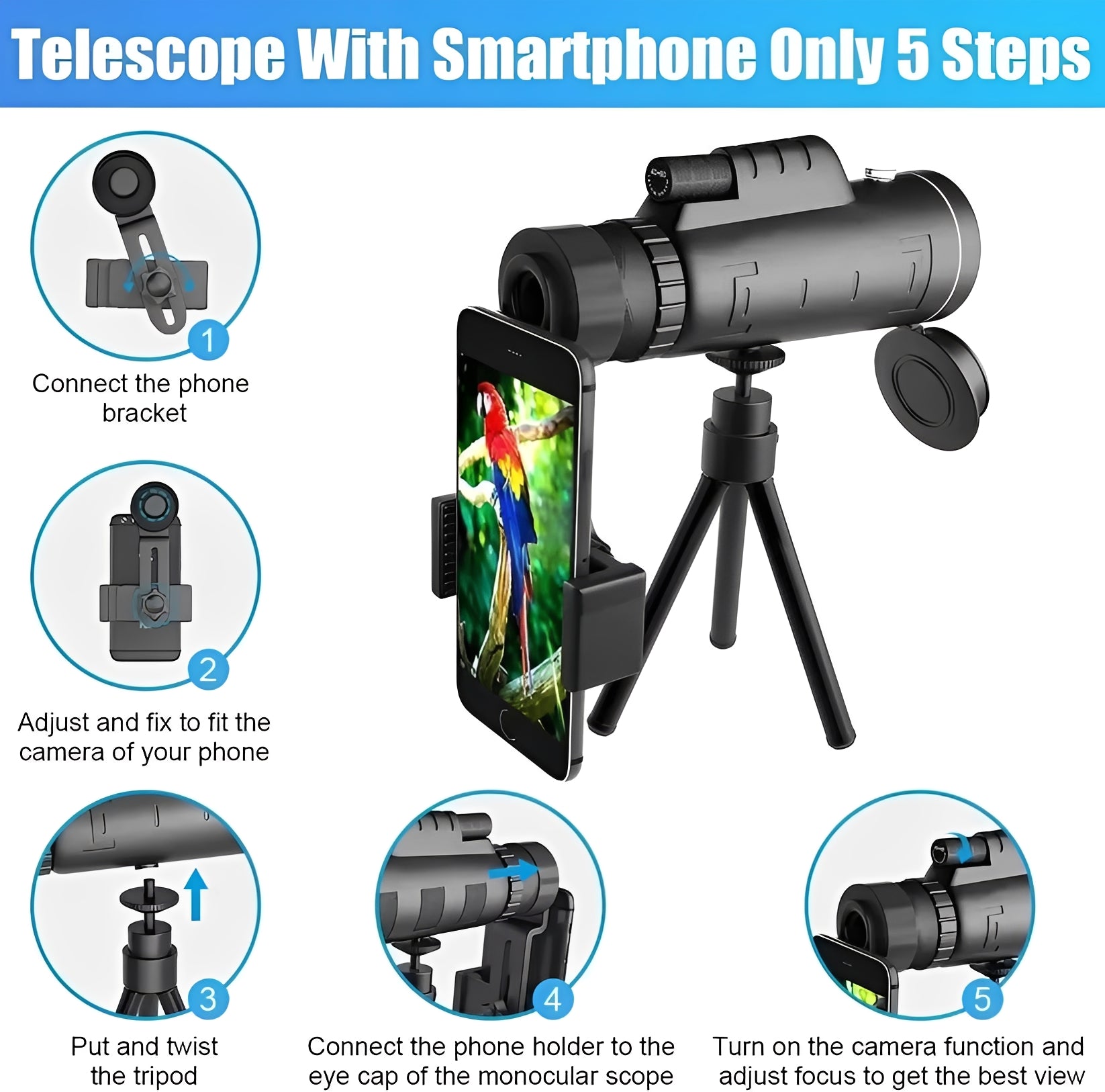 - Package contains: 1 x 40x60 HD Monocular Telescope set with phone holder and tripod