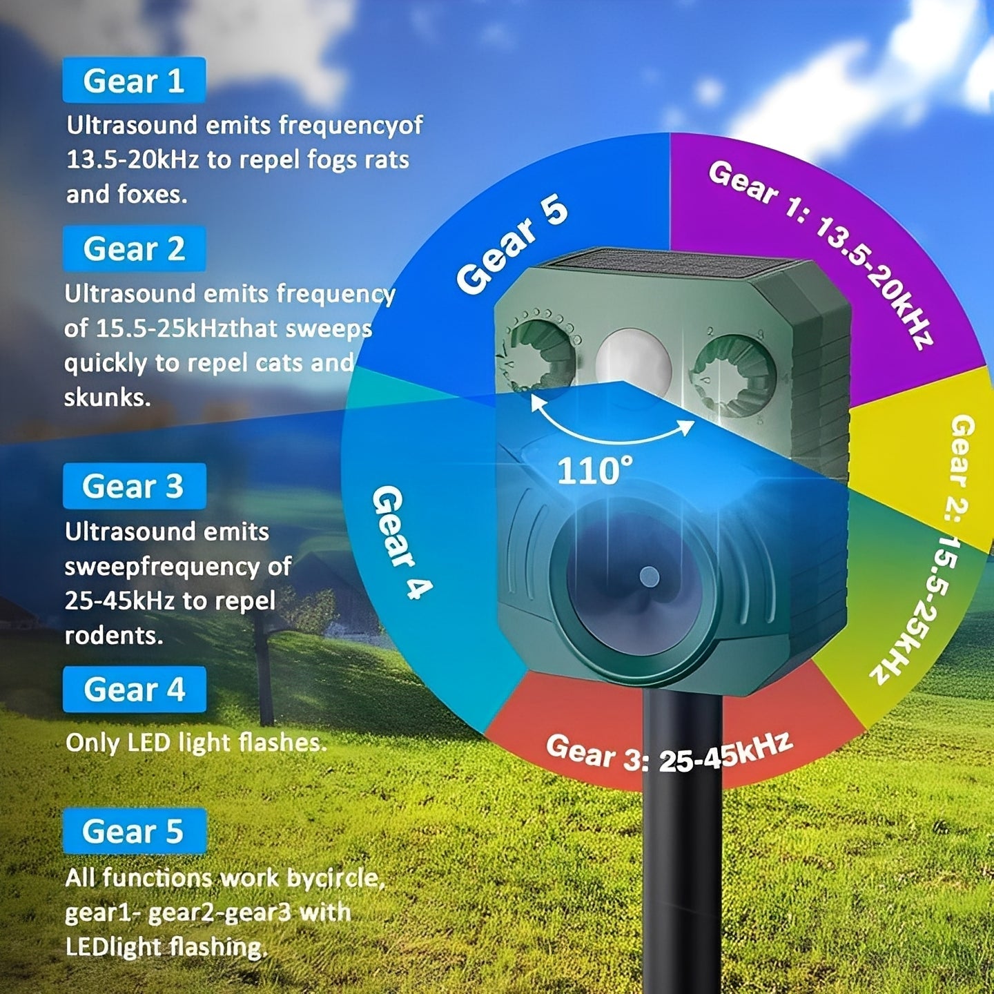 - Adjustable Frequencies: Offers five different ultrasonic frequency settings for targeting various animal species.