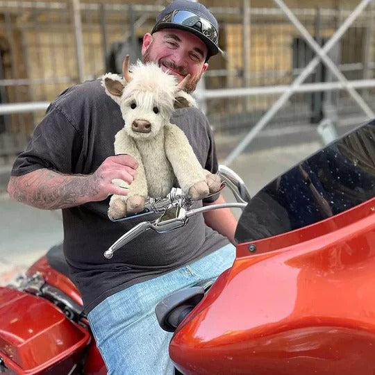 Hamish includes traditional cotter-pin joints that enable various poses. Its wired ears can be adjusted for different expressions, while the hand-sculpted polymer clay horns add a unique touch. A sound feature in the right foot produces a gentle "moo" sound.