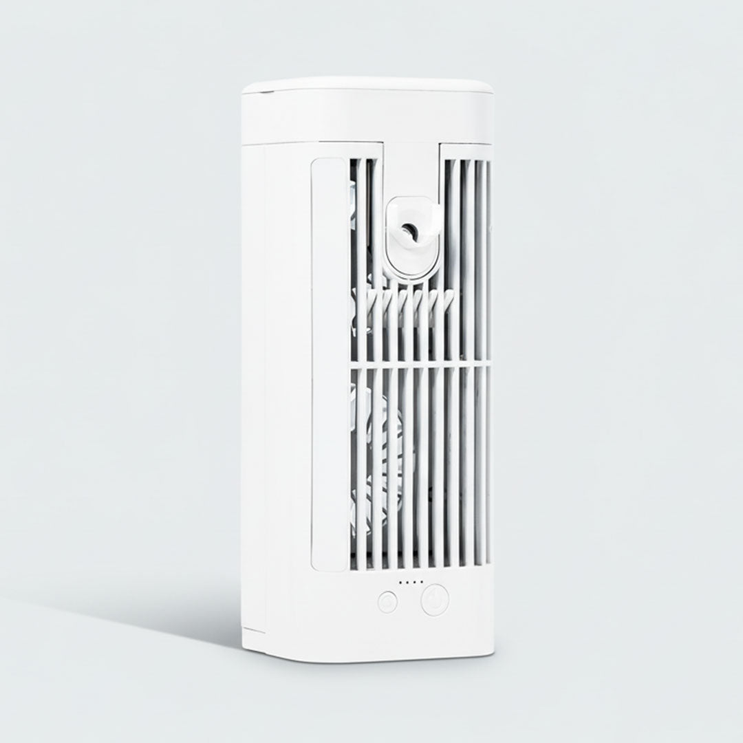 This portable air cooler is designed to provide a refreshing airflow and mist spray for personal spaces. Intended for use at workstations, bedrooms, or while traveling, it offers a compact solution for comfortable indoor environments.