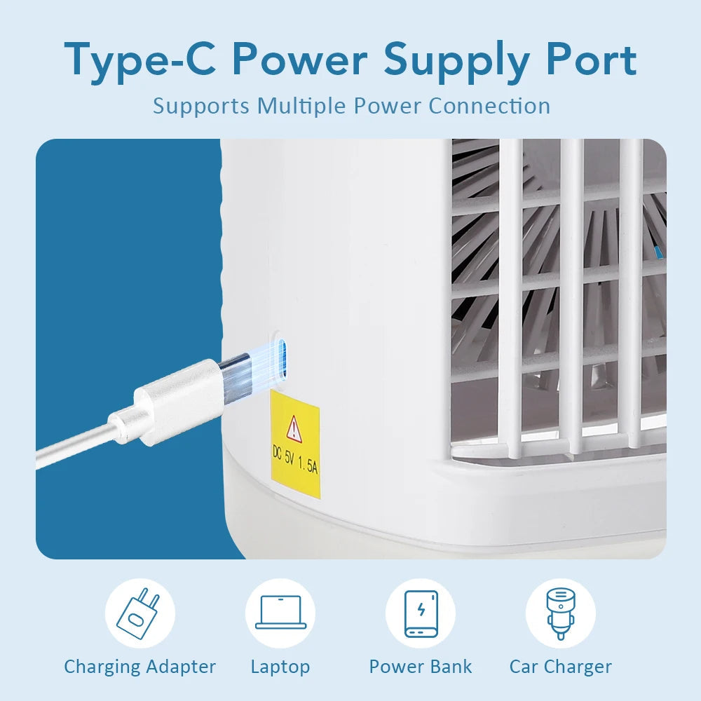 This mini air cooler features a USB-powered design that utilizes water evaporation to release cool mist while circulating air effectively. It is intended to provide a refreshing experience in various settings, ensuring comfort during warm days or dry indoor conditions.